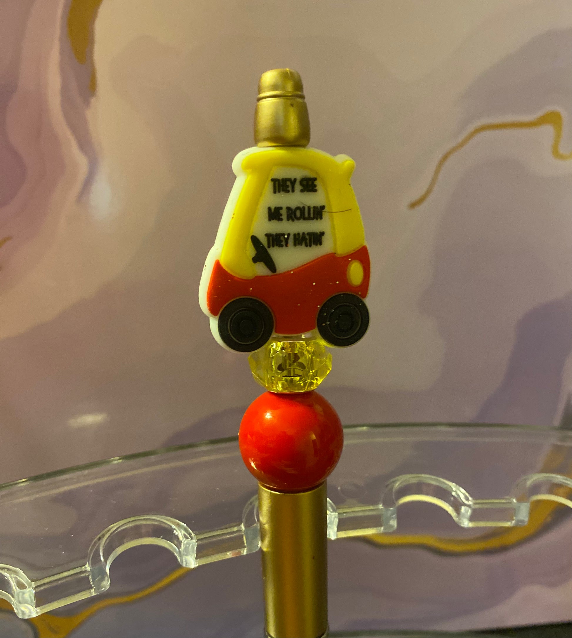 Buggy beaded pen. This pen is handmade,it is black ink, and it’s unique in its own way. This pen is not intended for small children. It is made out of beads and can be a choking hazard to some kids.  Thank you for visiting my shop!