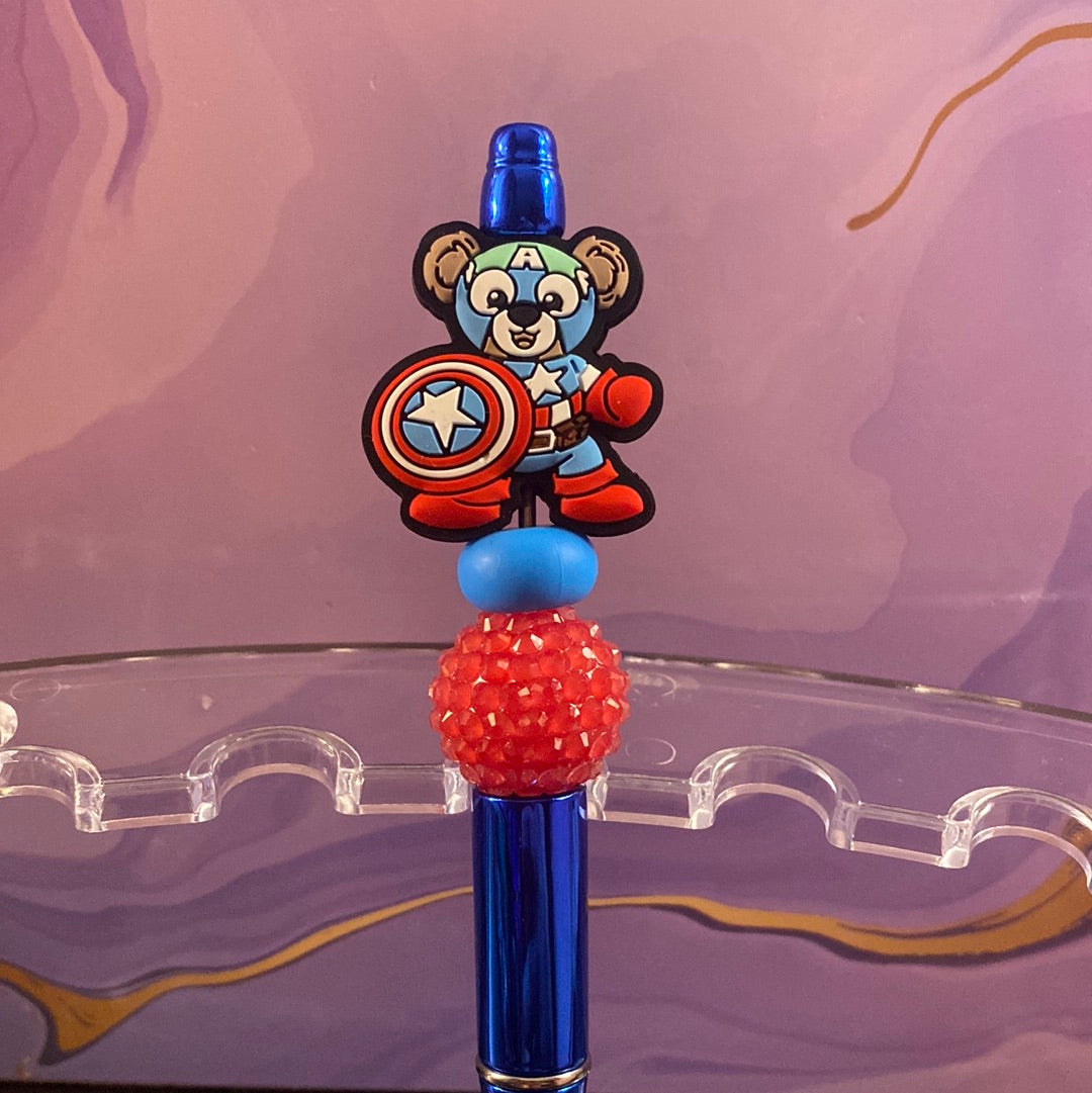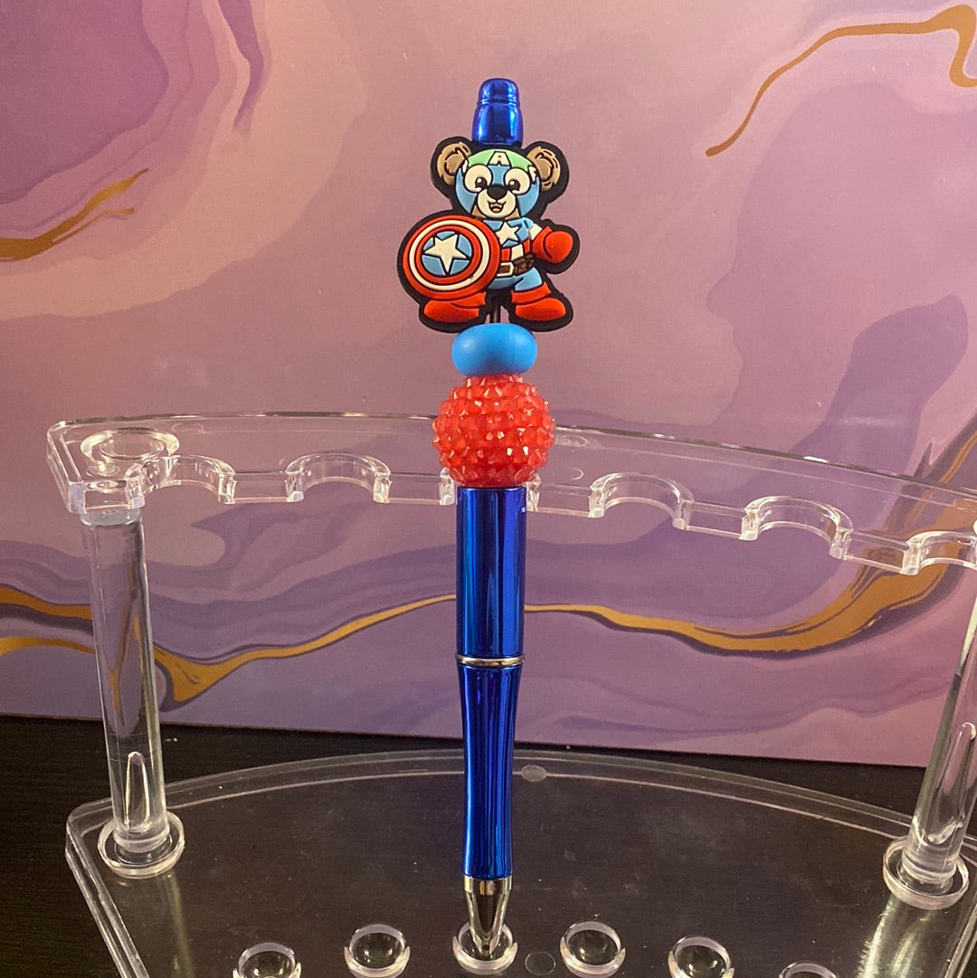 Captain Teddy beaded pen. This pen is handmade,it is black ink, and it’s unique in its own way. This pen is not intended for small children. It is made out of beads and can be a choking hazard to some kids. Thank you for visiting my shop!