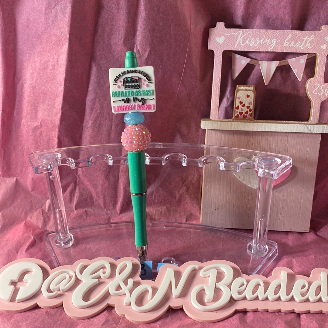Laundry beaded pen. This pen is handmade,it is black ink, & it’s unique in its own way. This pen is not intended for small children. It is made out of beads and can be a choking hazard to some kids.  I have many more pens on my profile if you’ll like to see more. Thank you for visiting my shop!