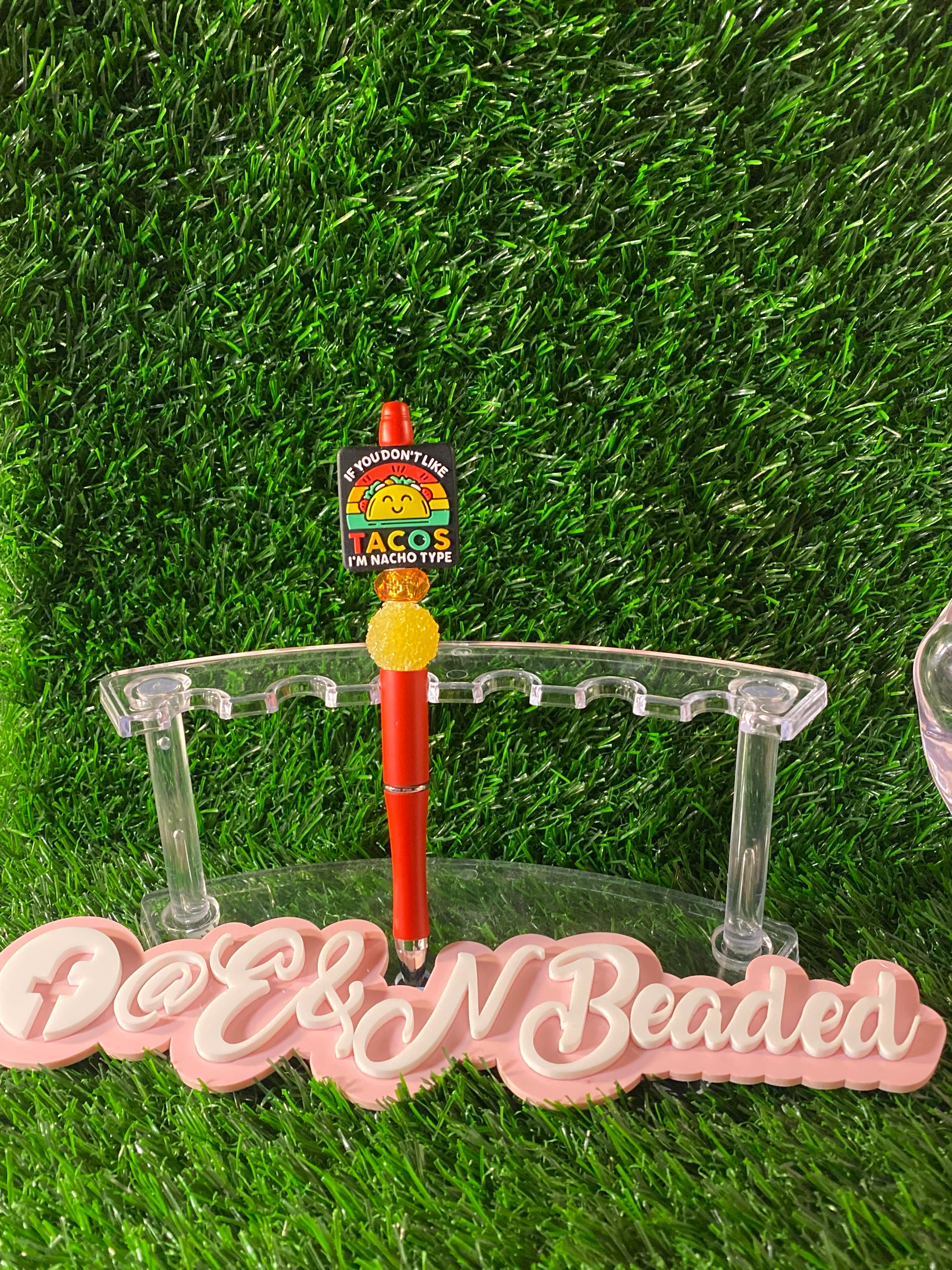 Taco beaded pen. This pen is handmade,it is black ink, & it’s unique in its own way. This pen is not intended for small children. It is made out of beads and can be a choking hazard to some kids. I have many more pens on my profile if you’ll like to see more. Thank you for visiting my shop!