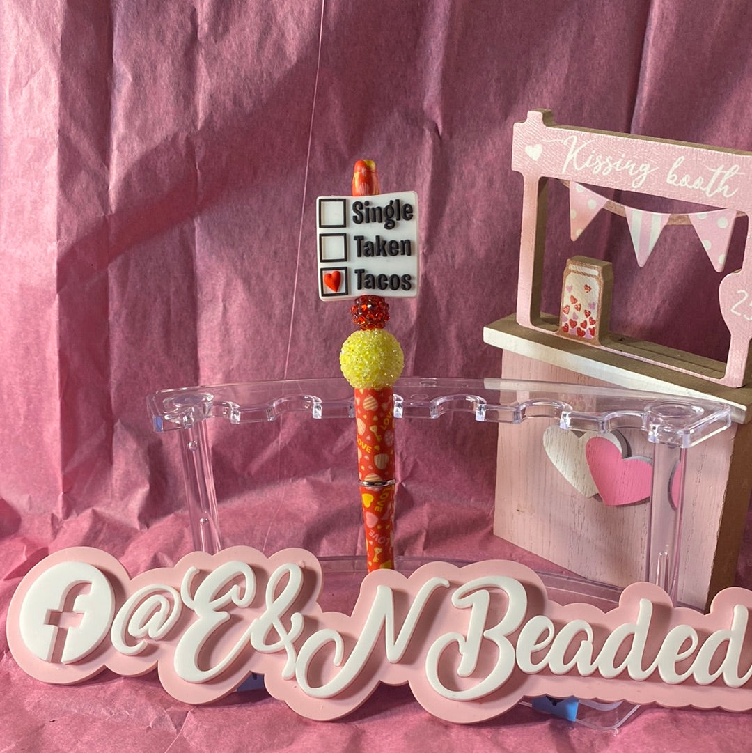Single,taken,tacos beaded pen. This pen is handmade,it is black ink, & it’s unique in its own way. This pen is not intended for small children. It is made out of beads and can be a choking hazard to some kids. I have many more pens on my profile if you’ll like to see more. Thank you for visiting my shop!